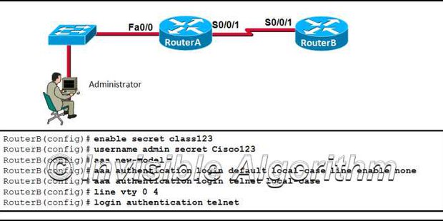4: efer to the exhibit. The administrator can ping the S0/0/1 interface of RouterB but is unable to gain Telnet access to the router using the password cisco123. What is a possible cause of the problem?
